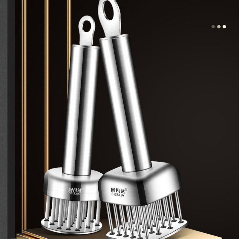 The beef tenderizer adopts a multi needle dense puncture structure, which can quickly cut off the coarse fibers and fascia inside the beef. It can significantly improve the softness and tenderness of the meat without long-term pickling, and can easily create a restaurant grade taste without clogging the mouth. It can make the seasoning penetrate into the meat faster, taste more evenly, shorten the pickling time, improve cooking efficiency, and is suitable for various meats such as steak, beef brisket, and pork chops.